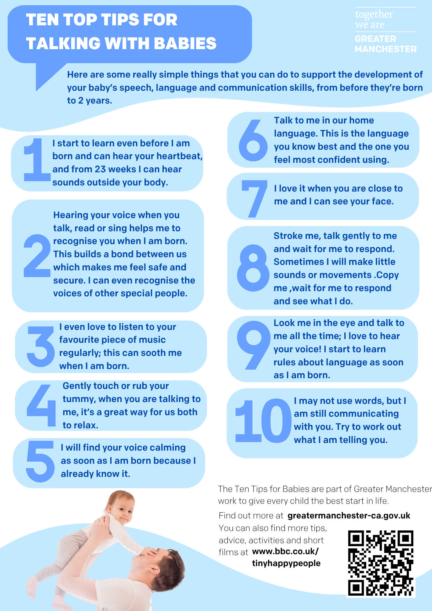 The GM 10 Tips for Talking with Babies, are ten key messages to support the development of speech, language and communication skills from before they’re born to 2 years. Each tip is designed to give families and anyone working with babies some small suggestions that can make a big difference and help give children the best start. Each message is based on sound research and is delivered by children.
